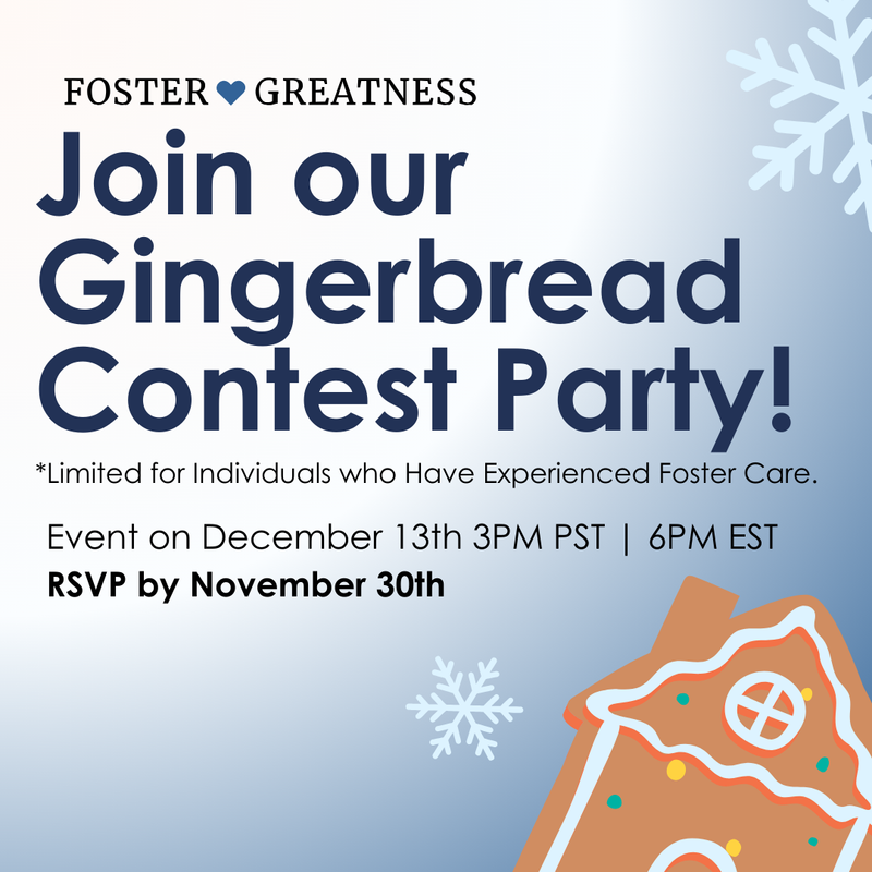 Well then, Foster Greatness has just the event for you! Join us on December 13th at 6pm EST for a Virtual Gingerbread House Contest Party! We’ll provide you with all the materials, a gift card to make your house unique, and the virtual space to join! So join us in your favorite holiday attire, come with all your stories, and let’s get creative!